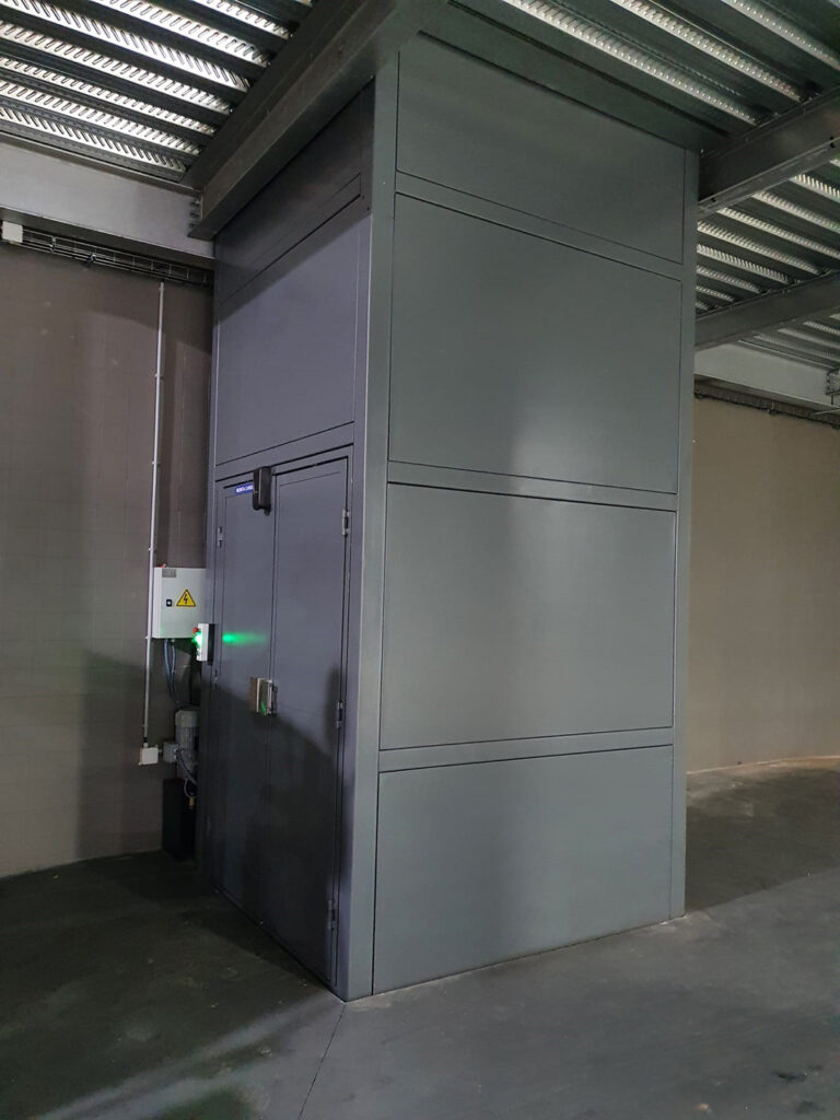 Plataforma elevatória vertical para cadeira de rodas para um curso até 3 metros e uma velocidade até 0,10 m/s. Com uma capacidade de 300 kg. O acesso no piso inferior, como no piso superior pode ser feito pelo mesmo lado, ou então com duplo acesso, as chamadas portas a 180º são alimentadas a 230V e é equipada com um sistema V.F que nos garante um baixo consumo.